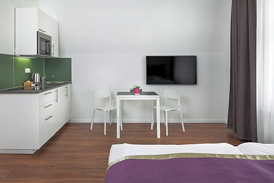 The suite has 1 bedroom and 1 bathroom with a bath or a shower and free toiletries. Guests can make meals in the kitchenette that features a stovetop, a refrigerator, kitchenware and a microwave. The suite features parquet floors, a seating area with a flat-screen TV with satellite channels, a tea and coffee maker, a wardrobe, as well as a safe deposit box. The unit has 1 bed.